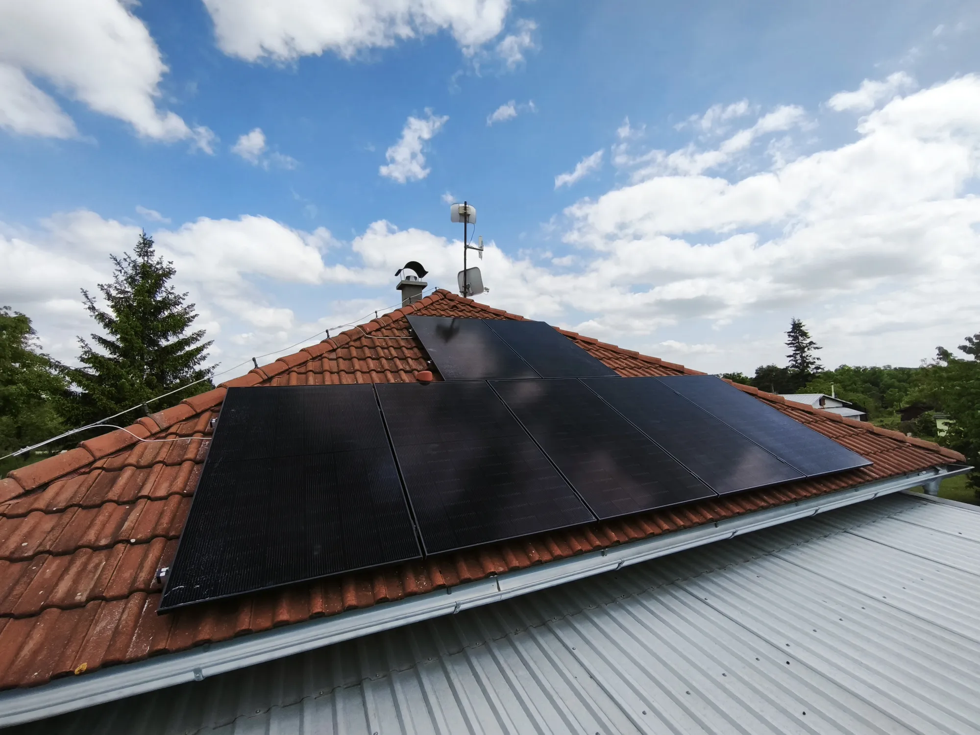 V průběhu následujícíh 14 dní jsme po veškerých přípravách a vyřízení nutné administrativy s distributorem naplánovali a realizovali instalaci panelů. Osazení střechy domu solárními panely nám zabrala dva pracovní dny. Poté, se dostavil náš technik, který umístil do suterénu domu technologii, vše propojil a ozkoušel a fotovoltaickou elektrárnu uvedl do testovacího provozu.